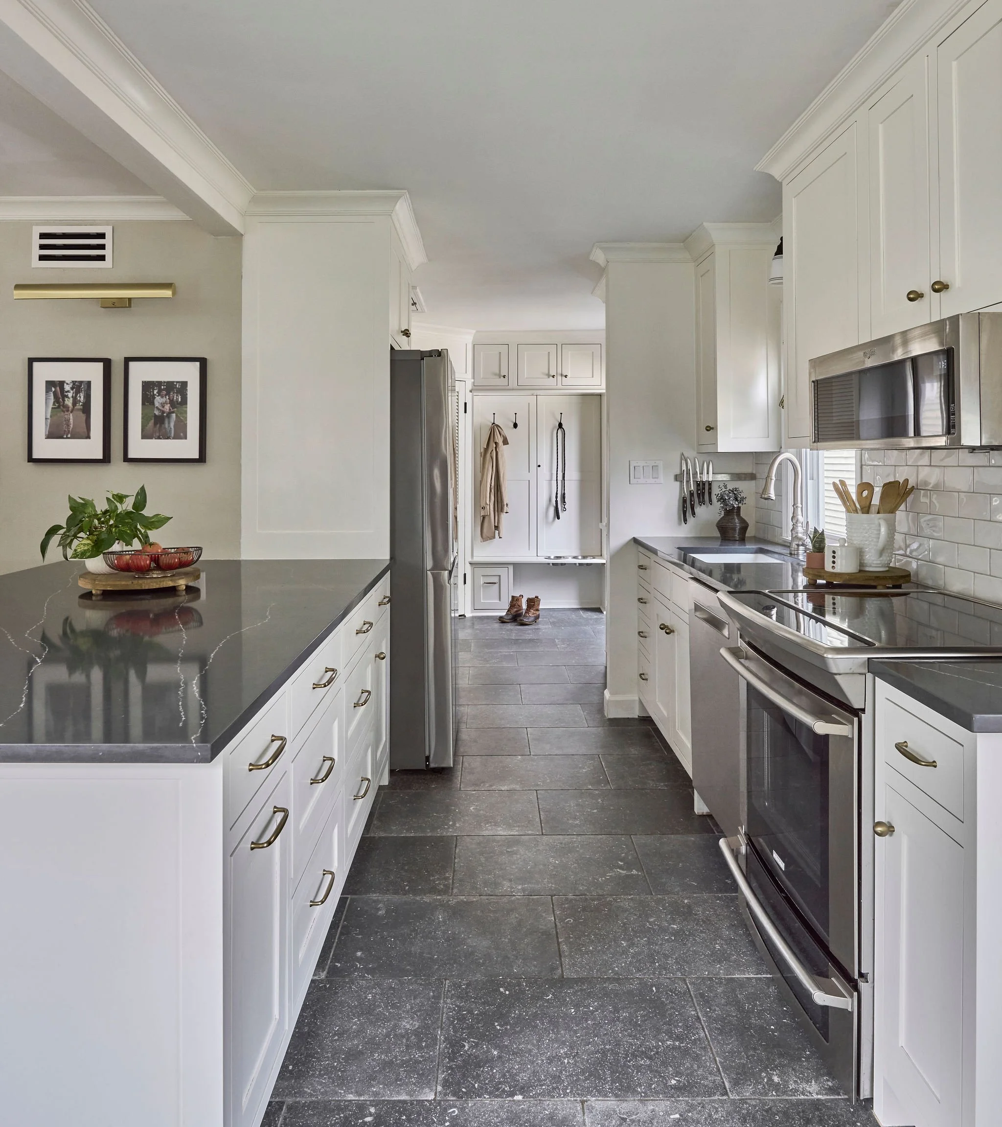 Tile: Floor, Wall, Accent: Floor Tile Floor & Decor Ardennes Bluestone Porcelain Tile / Backsplash MSI Whisper White Subway Tile