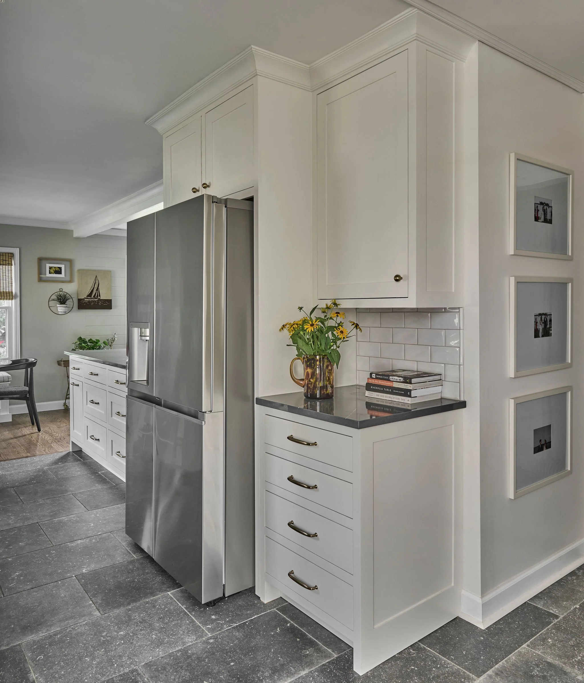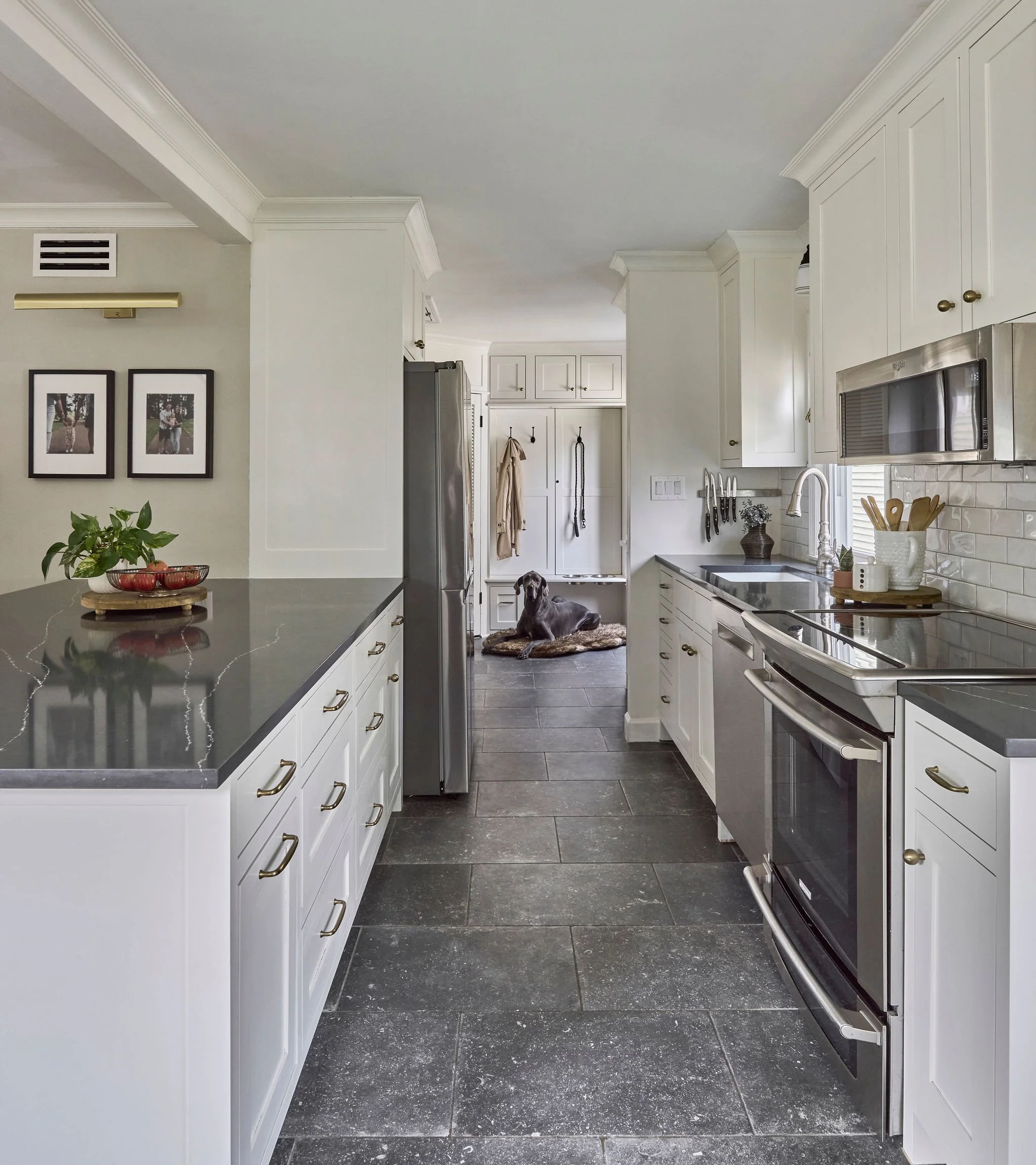 A special project that was our designer's personal home remodel. Brenna got to design her own kitchen and bathroom in their home they purchased. The bathroom was a facelift gut renovation with some specials features including a medicine cabinet, heated flooring, and bluetooth exhaust fan in the shower. The kitchen was a little more complicated with tearing down walls, relocating and converting to an electric stove, and adding a microwave hood with exhaust fan. The cabinets were custom built by her father who is a cabinet maker/carpenter which allowed her to incorporate some special features including a tall coat closet that looks like it's part of the cabinetry, a panel that hides the electrical box, and a secret baseboard drawer under the built in broom closet. We can't forget the built in dog bowls for their much loved great dane, Maize. Brenna embraced the cottage-like character of the home and kept finishes simple and classic with a touch of vintage.