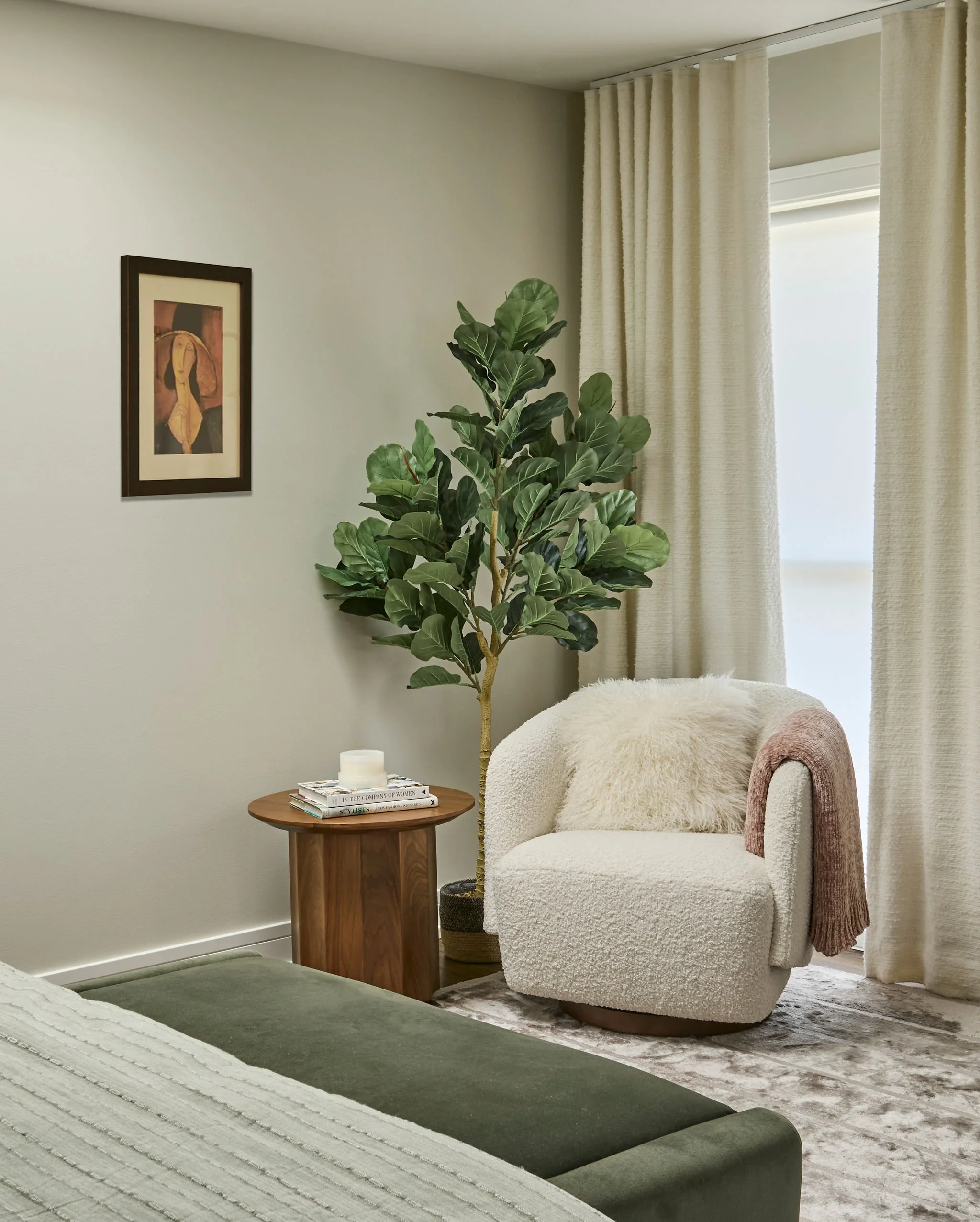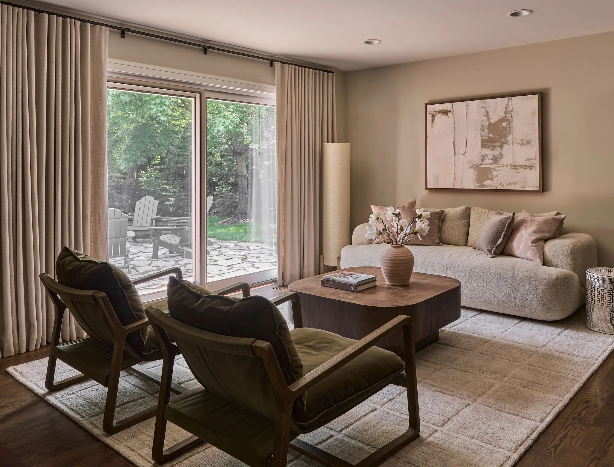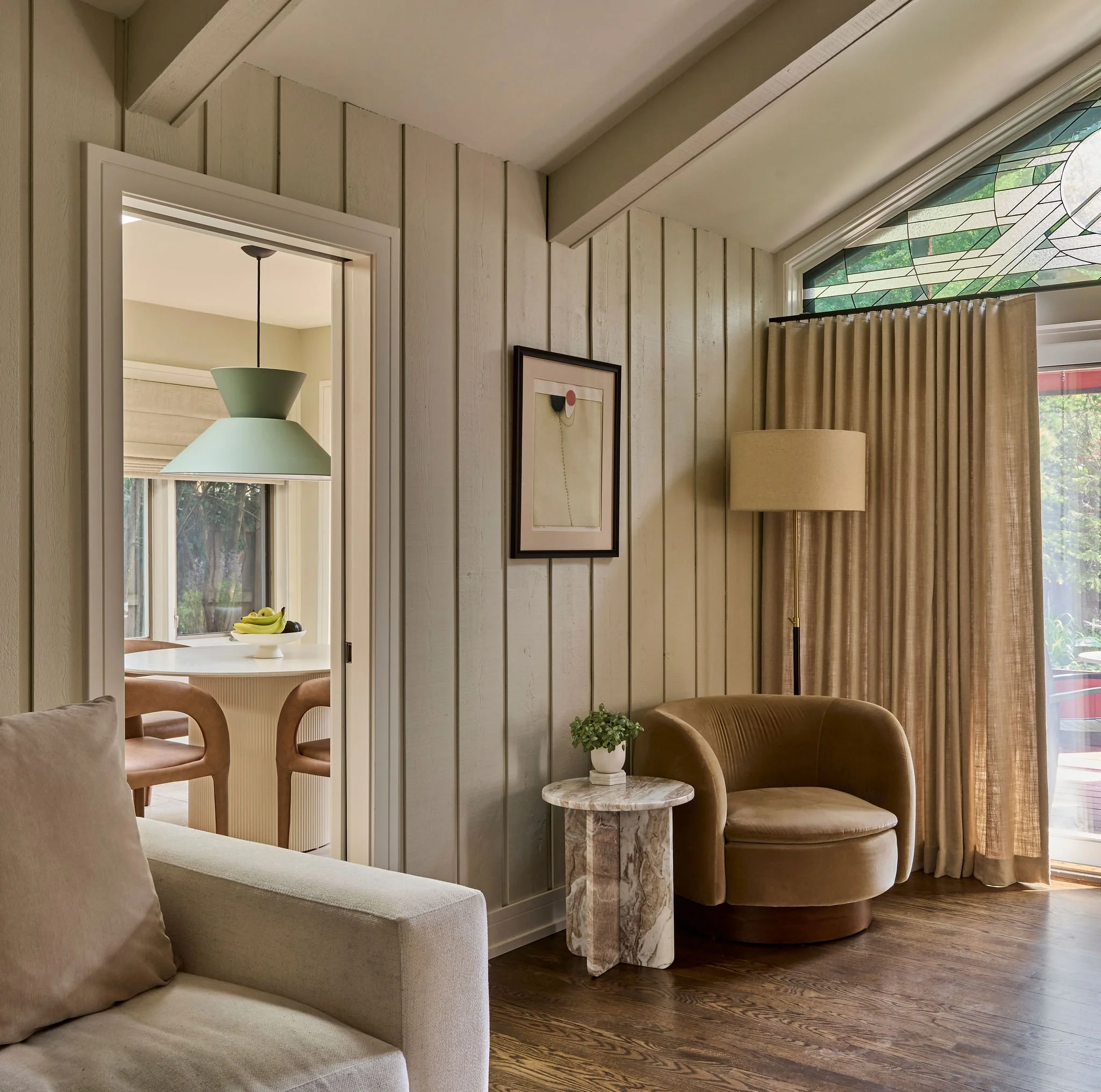 We highlighted this beautiful home with a complete overhaul that required no real demolition. This home design included refinishing the floors, changing baseboards, casings, and trim, updating light fixtures, specifying wallcovering and painting all walls, ceilings, doors, and trims, and changing out cabinetry hardware for the large architectural changes. From there, we specified furniture for all rooms including the primary bedroom and vanity, client's home office, baby nursery, living and family room, kitchen dining area, and entryway.