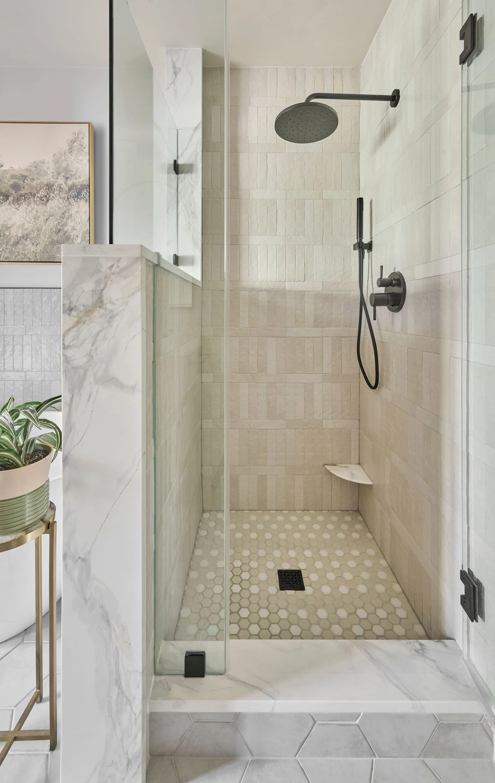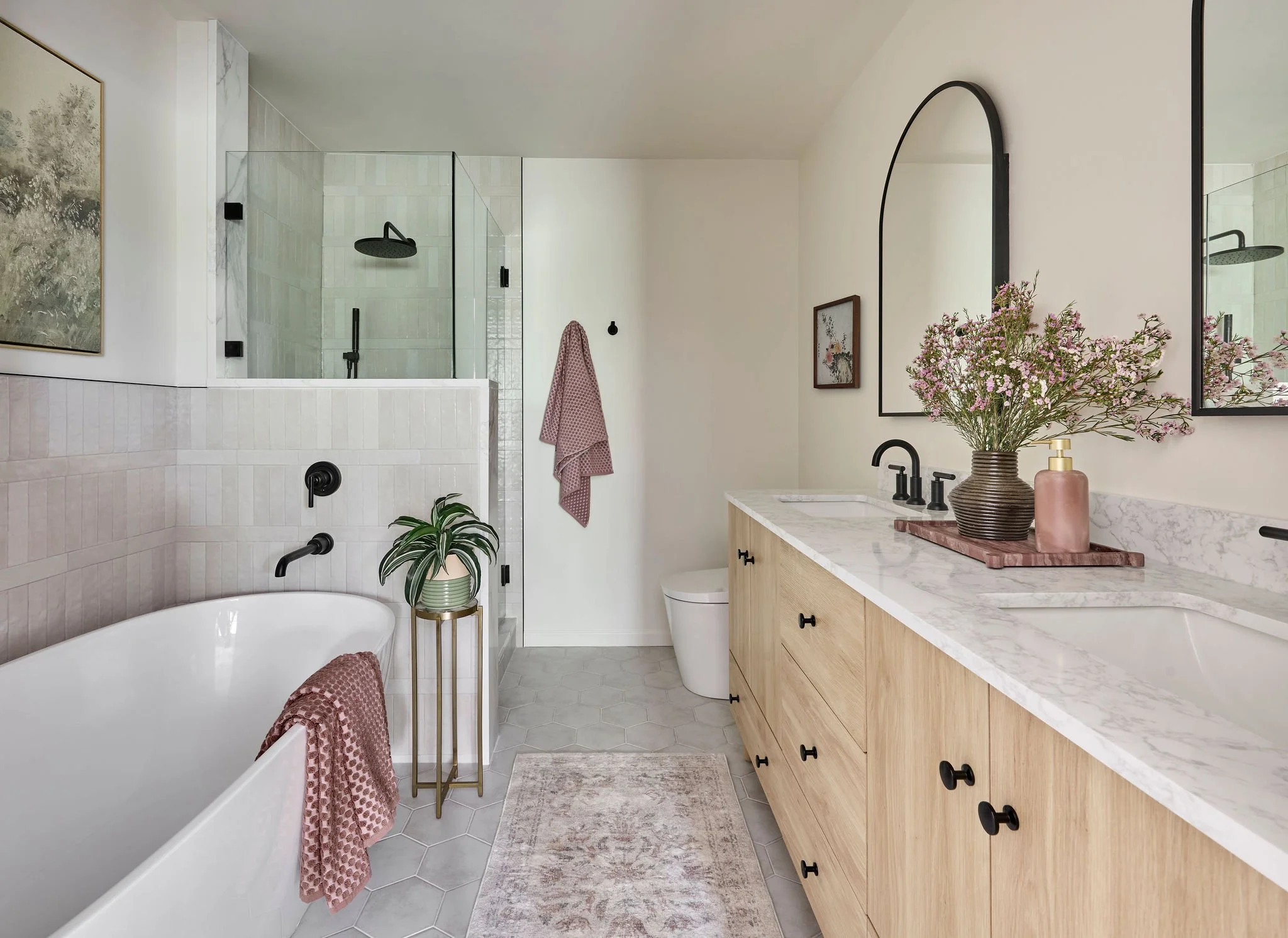 This once dark, builder-grade primary suite needed a refresh. We embraced neutral colors and natural materials to brighten the space and create a warm, inviting feel. The old, dusty jetted tub was replaced with an elegant freestanding tub for a spa-like upgrade. While the palette remains neutral, pops of color were added through carefully chosen accessories. Removing the partial shower wall brought in more natural light and created a luxurious shower experience—without sacrificing tub space.
